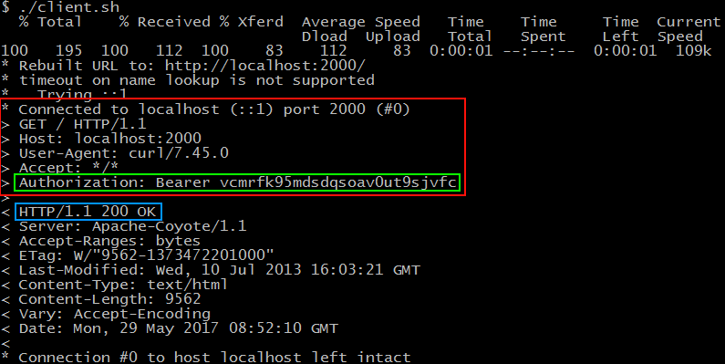 Figure 2 shows the request and response header when the client requests the protected resource. The red box is the request header, and in it, in the green box, is the authorization header with the access token. The blue box shows the response status code.